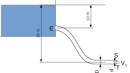 L'entrée \(E\) d'un tuyau et sa sortie \(S\) se trouvent à \(10\ m\) et \(30\ m\) sous la surface libre d'un réservoir de grandes dimensions.